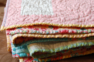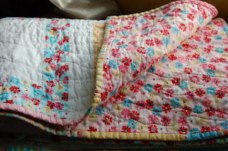 So yesterday I sat off and on when possible to finish the binding by hand on Emmalie’s quilt. By late afternoon I had finished – my hands were numb at that point so it was a good thing! It went straight to the wash, for the puckery finishing touch. I took it up to Em as she was trying to go to sleep – she looked at me with huge smiles, “I love my quilt – thank you mommy.” She melts my heart everytime =) We had a photo shoot with the quilt this morning –