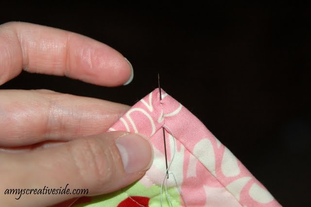 Fold the next edge over to form a miter. Slowly thread the needle between the two layers of binding fabric, usually up, down, up, to secure the miter.